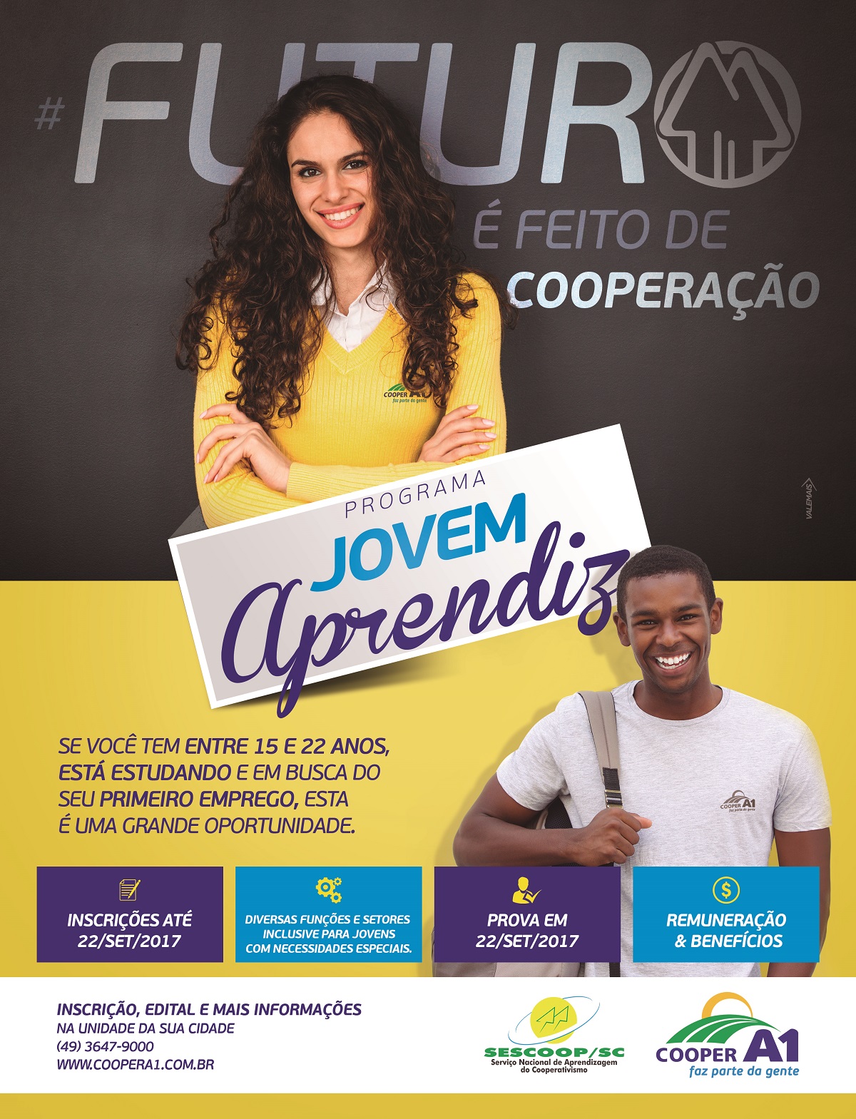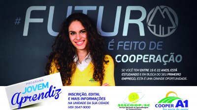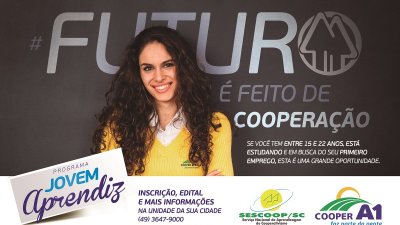 A Cooper A1, abriu, na segunda-feira, dia 21/08, o edital de processo seletivo para a quarta turma do Programa Jovem Aprendiz Cooperativo. Até 20 de setembro, as inscrições podem ser efetuadas no RH da matriz ou nas demais dez unidades da cooperativa em Santa Catarina. A contratação será de 50 jovens com idade entre 15 e 22 anos que devem estar cursando, no mínimo, o ensino fundamental. O período de aprendizagem será para 16 meses, e admissão dos selecionados será em novembro deste ano.