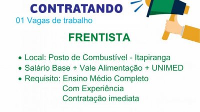 Se o ano começa depois do carnaval, então estamos oficialmente em 2019. E se você é da região de Itapiranga, SC, e está em busca de emprego, fique atento na vaga para frentista no Posto de Combustíveis da unidade. Mas atenção, o currículo deverá ser enviado até o fim desta terça-feira, dia 12.
