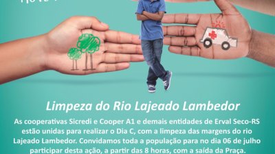 Limpeza do rio que passa no centro da cidade - Um mutirão de voluntários se reunirá, no dia 06/07, em Erval Seco, RS, para a limpeza das margens do rio Lajeado Lambedor, rio que atravessa a cidade. A iniciativa é da Cooper A1 e do Sicredi e tem apoio de entidades locais. Toda comunidade está convidada a participar da limpeza, com saída da praça, a partir das 8 horas.