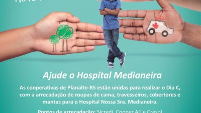 Ajude o Hospital Medianeira - Em Planalto, RS, as cooperativas do município são unidas para auxiliar a entidade hospitalar do município. Neste ano está acontecendo a campanha de arrecadação de roupas de cama, travesseiros, cobertores e mantas para o Hospital Nossa Sra. Medianeira. As doações vão até dia 05/07, e pontos de arrecadação são na Cooper A1, Sicredi e Cresol.