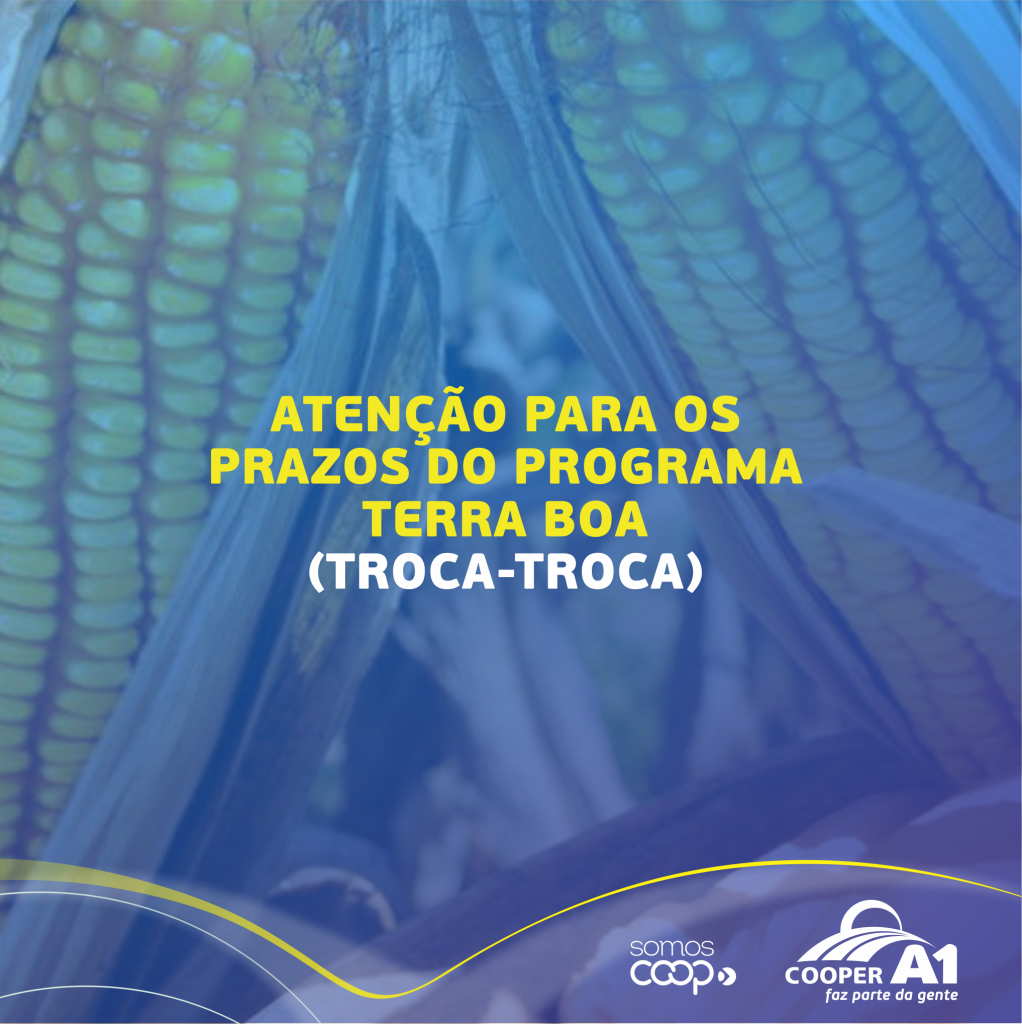 Atenção produtores rurais para a data de vencimento do programa Terra Boa (Troca-troca). A Cooper A1 informa aos produtores beneficiados com sementes de milho e de calcário, que o vencimento dos contratos, para ter direito ao bônus e descontos, vai até 26 de abril. Para mais informações os interessados podem entrar em contato com os setores administrativos e financeiros da unidade mais próxima.