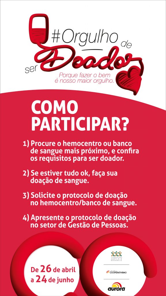 A Campanha #OrgulhoDeSerDoador tem a participação e apoio da Fundação Aury Luiz Bodanese, do projeto Acredite no Cooperativismo e das cooperativas filiadas ao Sistema Aurora: Cooperalfa, Auriverde, Cocari, Cooasgo, Cooper A1, Coopervil, Copercampos, Copérdia e Cooperitaipu.