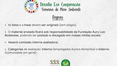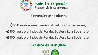 As categorias do Desafio Eco Cooperação incluem interno (empregados Aurora Alimentos) e externo (comunidade em geral). Serão premiadas, por categoria, as melhores fotografias de todos os desafios cumpridos; a imagem mais representativa/reflexiva de um desafio e a frase mais criativa que represente o desafio. A divulgação dos ganhadores será no dia 21 de junho nas mídias sociais da FALB (Instagram, Facebook e site). A FALB também entrará em contato com os ganhadores via telefone.