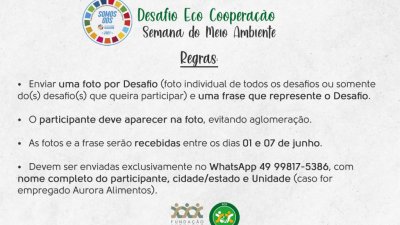 O desafio ambiental é válido para toda a comunidade. As fotos devem ser enviadas exclusivamente para o WhatsApp da FALB - (49) 99817-5386 - entre os dias 1º e 7 de junho, com nome completo, cidade, estado e unidade da Aurora (caso o participante seja empregado), além de uma frase que represente as tarefas. As fotos e a frase devem ser originais e o participante deve aparecer nas imagens (sem aglomerações).