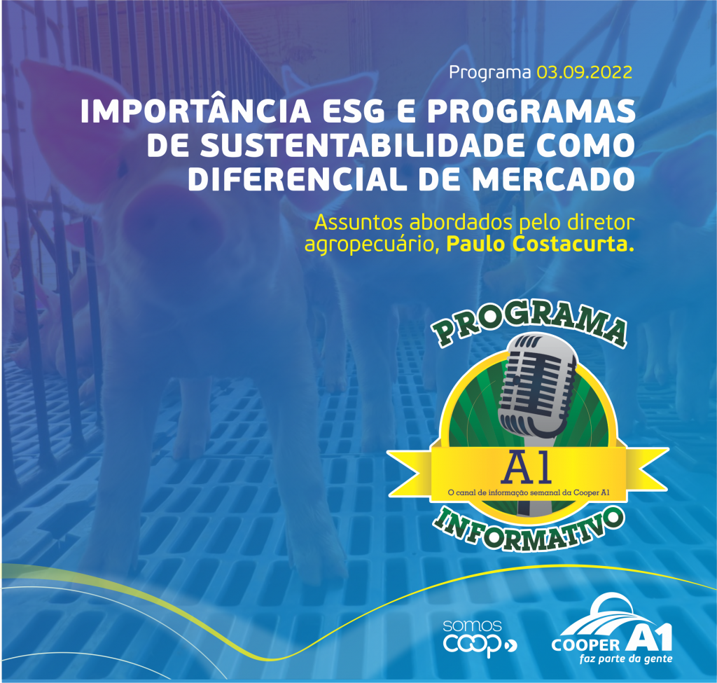 No Informativo A1 do primeiro sábado de setembro contou com a participação do diretor agropecuário, Paulo Costacurta, falando sobre ESG, sigla que representa as práticas ambientais, sociais e governamentais que as empresas adotam, e sobre os programas de sustentabilidade para um diferencial de mercado agropecuário e a importância destes programas para que o produtor conheça mais, abra seus horizontes e se mantenham atualizados.