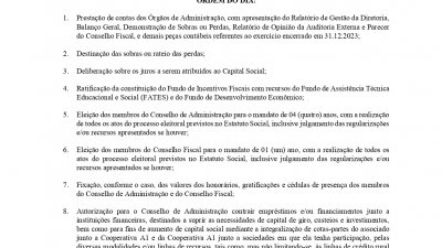 Exercendo um dos princípios do cooperativismo, a ‘Gestão democrática’, a Cooper A1 convoca seus cooperados para a assembleia geral ordinária. A AGO ocorre no dia 25 de março em Palmitos, SC.