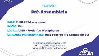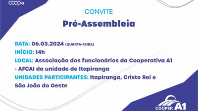 Seguindo as diretrizes de uma cooperativa, a Cooper A1 promove na segunda semana do mês de março as pré assembleias para os cooperados do Rio Grande do Sul e de Santa Catarina. De acordo com o terceiro princípio do cooperativismo, ‘gestão democrática’: As cooperativas são organizações democráticas controladas por todos os seus membros, que participam ativamente na formulação de suas políticas e na tomada de decisões. E os representantes oficiais são eleitos por todo o grupo.