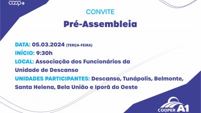 O mês inicia com a pré assembleia de líderes cooperados que ocorre no dia 4 de março na Associação dos Funcionários de Palmitos às 9 horas, o almoço será servido no local. Já as pré assembleias para cooperados seguem o seguinte cronograma: