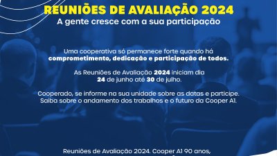 No dia 24 de junho iniciam as Reuniões de Avaliação da Cooper A1, a qual é um canal de comunicação e transparência entre cooperativa e quadro social. Este é um dos momentos em que o cooperado tem a oportunidade de conhecer os números socioeconômicos, investimentos e ações do primeiro semestre do ano, que são explicados pelos diretores e gerentes de atividades.